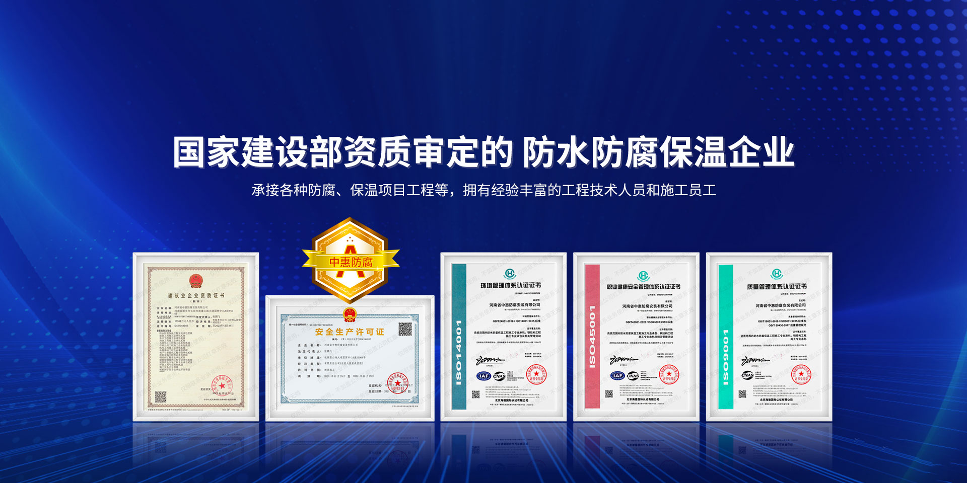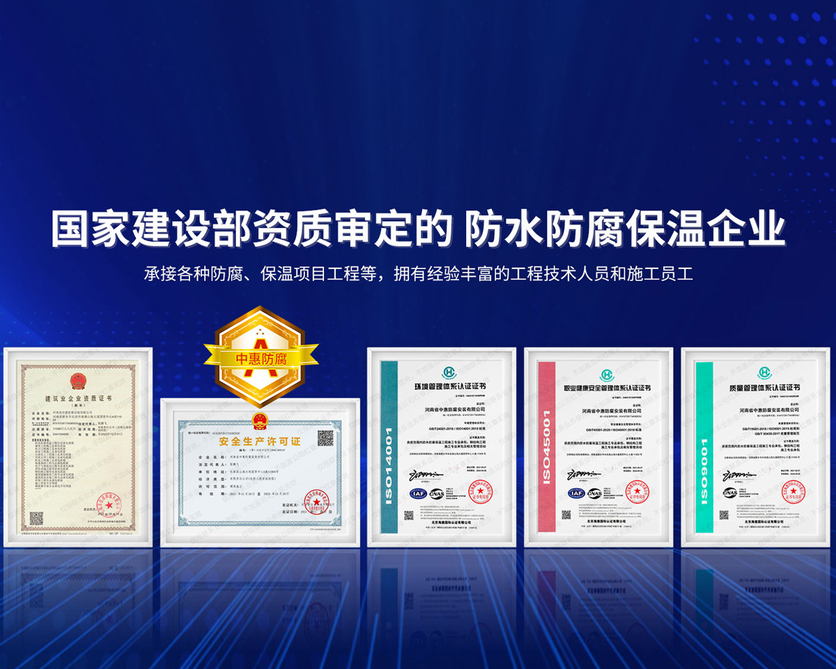 公司經營范圍:防水防腐保溫工程;消防設施工程;建筑裝修裝飾工程;建筑機電安裝工程;電力工程;建筑工程;石油化工工程;工業清洗工程;油罐清洗工程;鋼結構工程;環保工程;模板腳手架工程;電纜防火封堵、防污閃噴涂、外墻外保溫工程;各類施工勞務作業;設備維修、船舶鉚焊、涂裝;電力工程材料、建材、防水材料、防火材料、防腐保溫材料銷售,并相繼通過了GB/T19001-2008idtISO9001:2008GB/T50430-2007質量管理體系認證證書。GB/T24001-2004idtISO14001:2004環境管理體系認證證書。GB/T28001-2011idtOHSAS18001:2007職業健康安全管理體系認證證書。公司是中國防腐蝕于防護協會、中國施工企業管理協會、電力協會和中國鋼結構防水協會會員單位。 公司的經營業務涵蓋了石油、化工、電力、冶金、煤炭、船舶、國防、燃氣、水利、環保、交通運輸、航空及國防軍工和輕紡市政等行業的防腐保溫絕熱設備。鋼結構安裝、防火、防水、金屬噴鍍、聚脲噴繪、陰極保護、防滲透堵漏、玻璃鋼及各種磚版材料襯里、橡膠襯里、煙氣硫和耐酸溶劑腐蝕等工程施工。公司連續十年榮獲“省市先進施工企業”“安全生產先進單位”“重合同,守信用企業”和“AA***資質企業”的稱號。2000年被命名為市級文明單位,2002年被國家工商行政管理局命名為“重合同,守信用的企業”、被中國工業防腐蝕技術協會命名為“防腐蝕企業,能源節約及環境保護領域有豐富的經驗和***的業績。工程一次交驗合格率100%。其中攀枝花鋼鐵公司煉鐵廠四號高爐及熱風爐防腐工程、上海寶鋼公司煤氣柜防腐工程、撫順石油一廠裝置防腐項目、齊魯石化公司稀烴廠高塔防腐工程、吉林化學工業公司煉油廠油罐防腐工程、天津石化熱電廠六號爐頂棚聯絡管保溫工程、大慶油田(太倉)力神泵業工程、中國化學工程第十一建設工程、中原油田勘探局工程、中國石化銷售有限公司華北分部、魯皖輸油管道工程、貴州開磷息烽合成氨工程、陜西黃陵煤化工程、中國石油天然氣西部管道塔里木輸油工程、邯鋼集團邯寶鋼鐵公司煉鐵工程、德州供電工程、吉寶(南通)船廠工程,偃師華潤熱力工程、鄭州熱力總公司。 河南省中惠防腐安裝有限公司愿以豐富的施工經驗,***的技術,***的設備,***的管理,***的服務,竭誠為國內外廣大的用戶提供***滿意、******的工程作品。 我公司愿與國內外同仁一道,團結協作,共同推進防腐蝕行業發展! 公司地址:河南省長垣縣建設路北段360號 固定電話:0373-8866488 郵編:453400 網址:http://www_zhff_com_cn.xqtpq.com